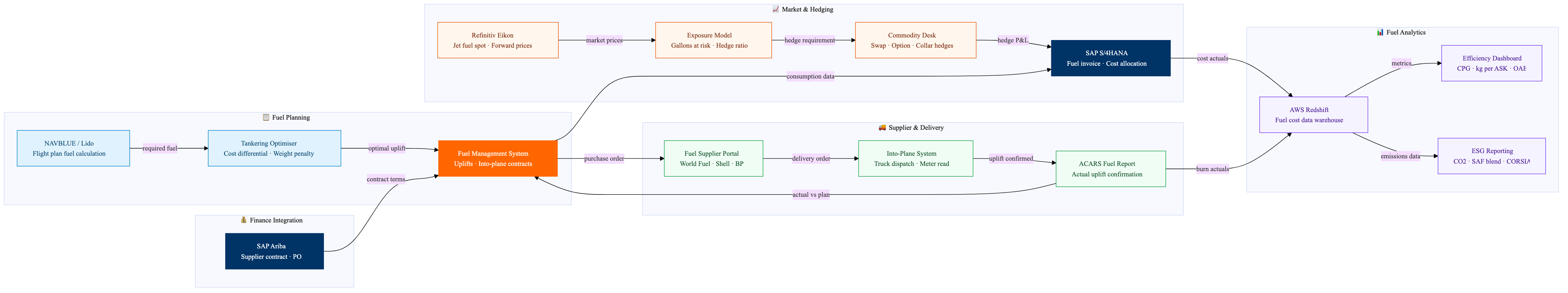 Fuel planning, hedging, into-plane delivery and cost accounting flows