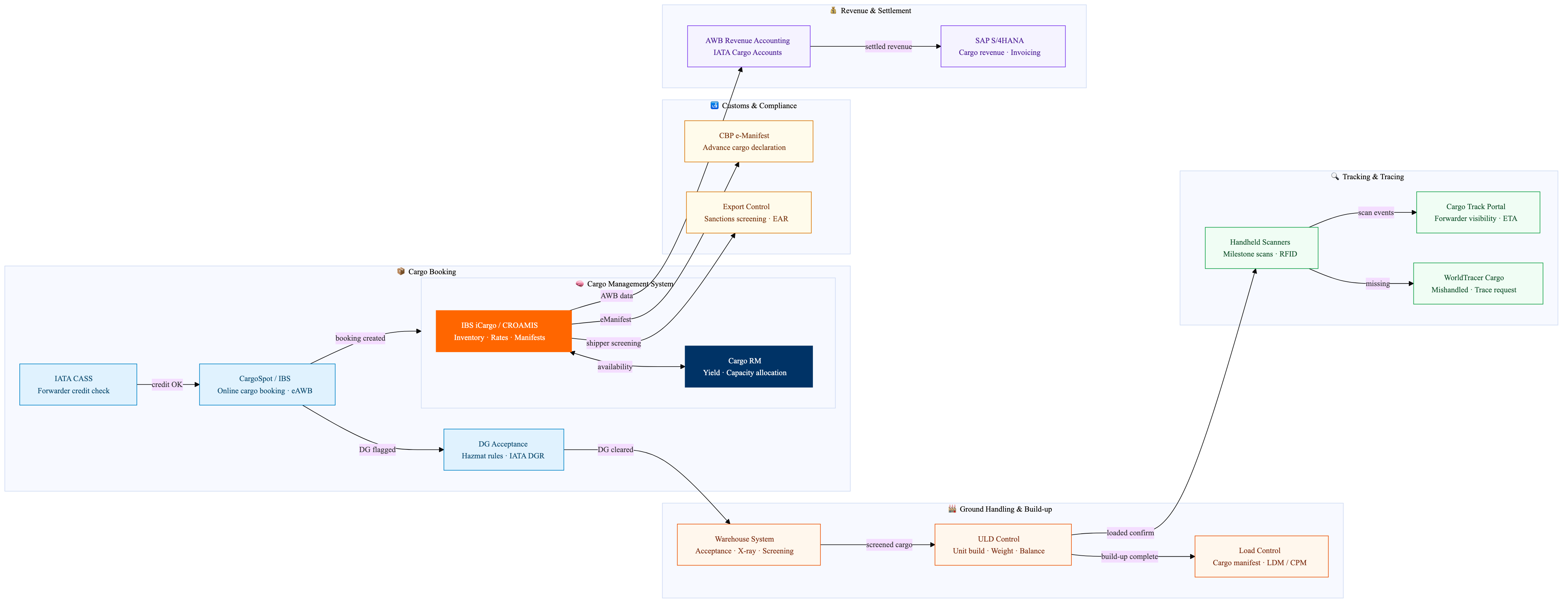 Air cargo booking, dangerous goods, ULD build and revenue settlement flows