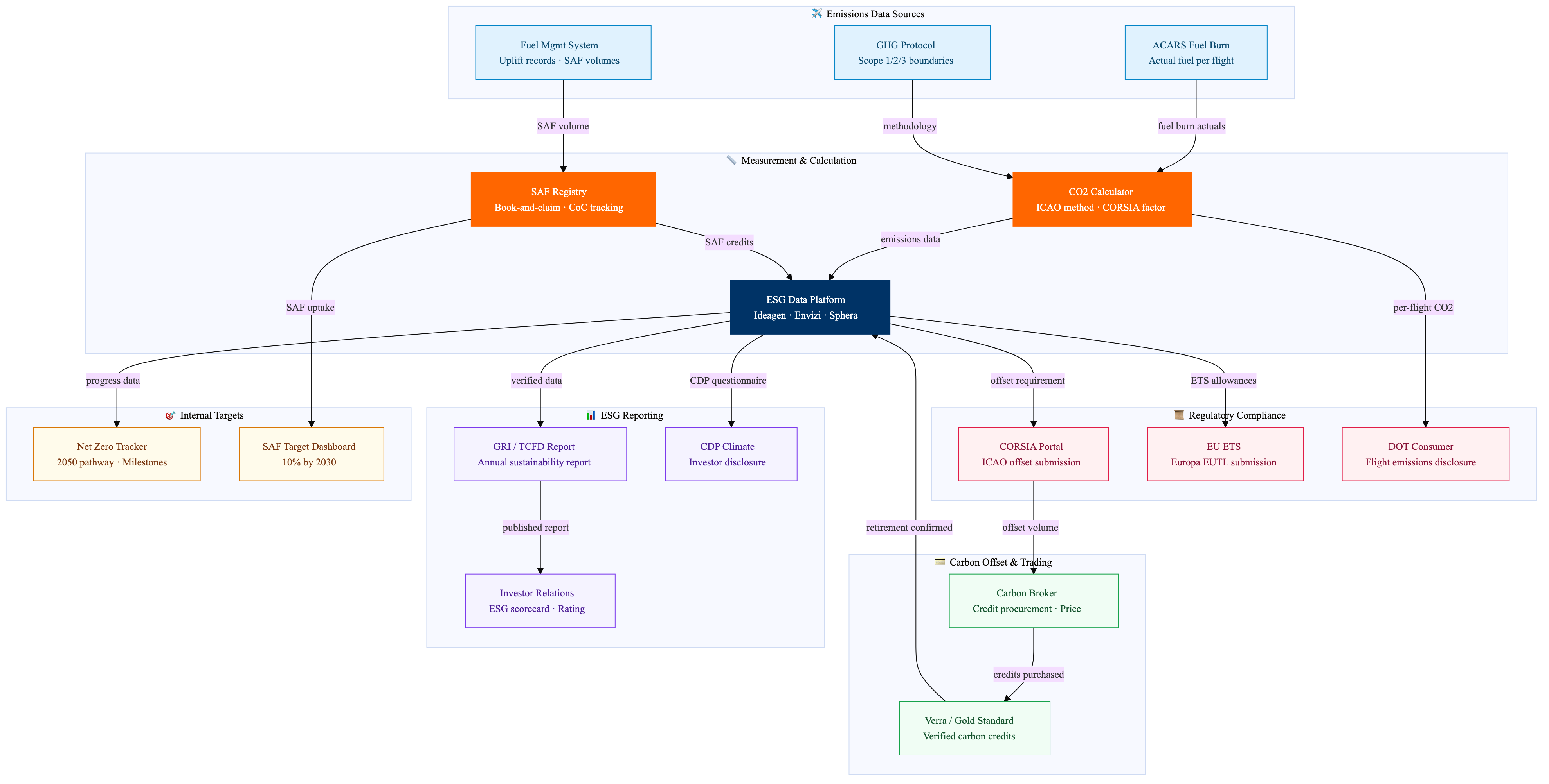Carbon measurement, SAF tracking, CORSIA compliance and ESG reporting flows