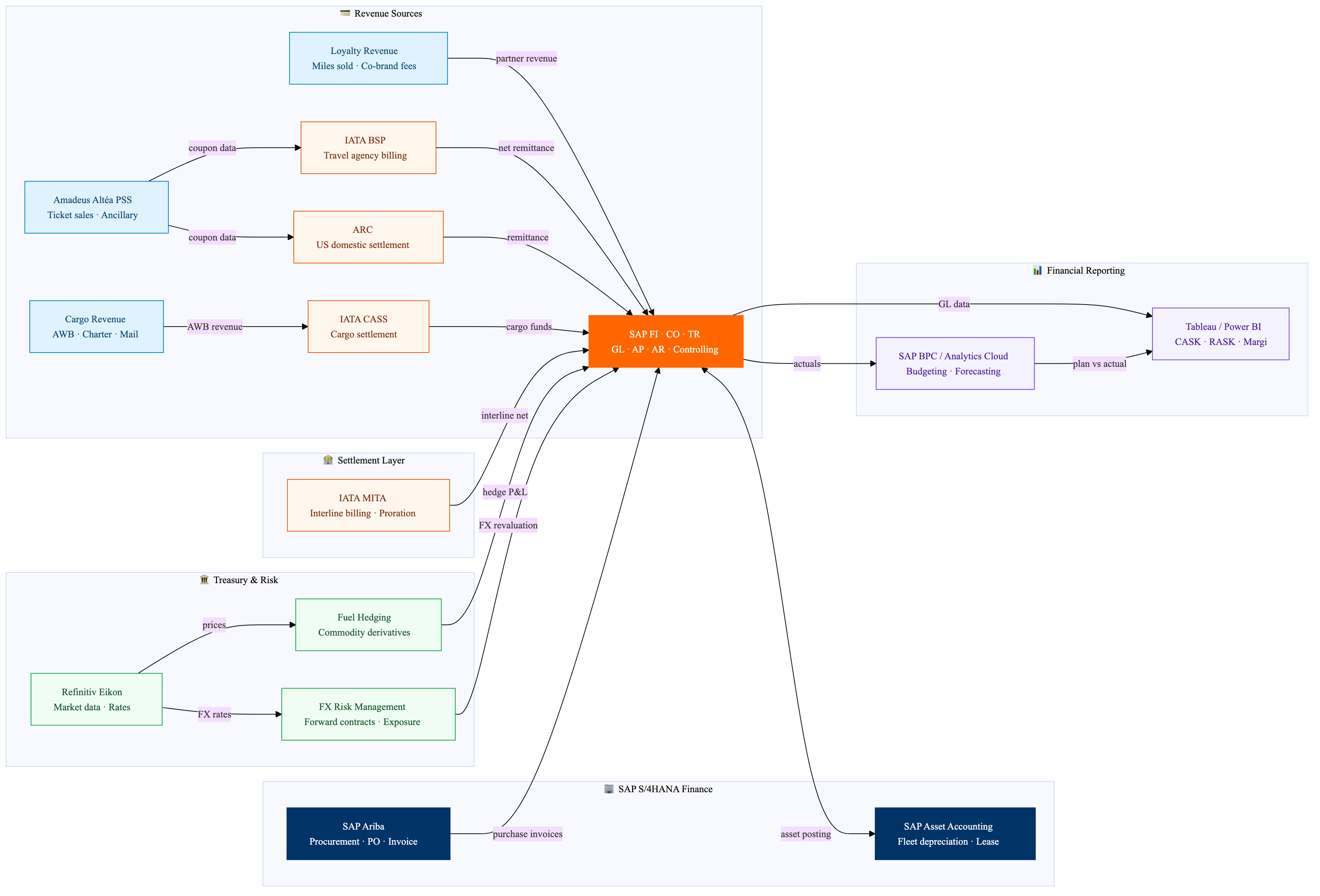 Ticket revenue, interline settlement, cost accounting and treasury data flows